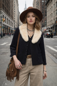 Beautifully made and effortlessly elegant, this 1950s Lillie Rubin New York jacket embodies the refined glamour of mid-century fashion. Tailored in soft black wool and finished with a creamy genuine mink collar, it features three-quarter sleeves, covered buttons, and two front pockets—a thoughtful, functional detail that enhances its classic boxy silhouette. The jacket closes at the neckline with a discreet furrier hook-and-eye clasp, while the buttons serve as decorative accents. Designed to layer gracefully over a slim dress or blouse, it remains both practical and chic.