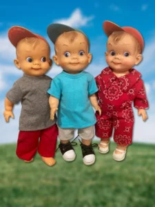 Initially, these dolls were sold in baseball uniforms, but all three have since been redressed.